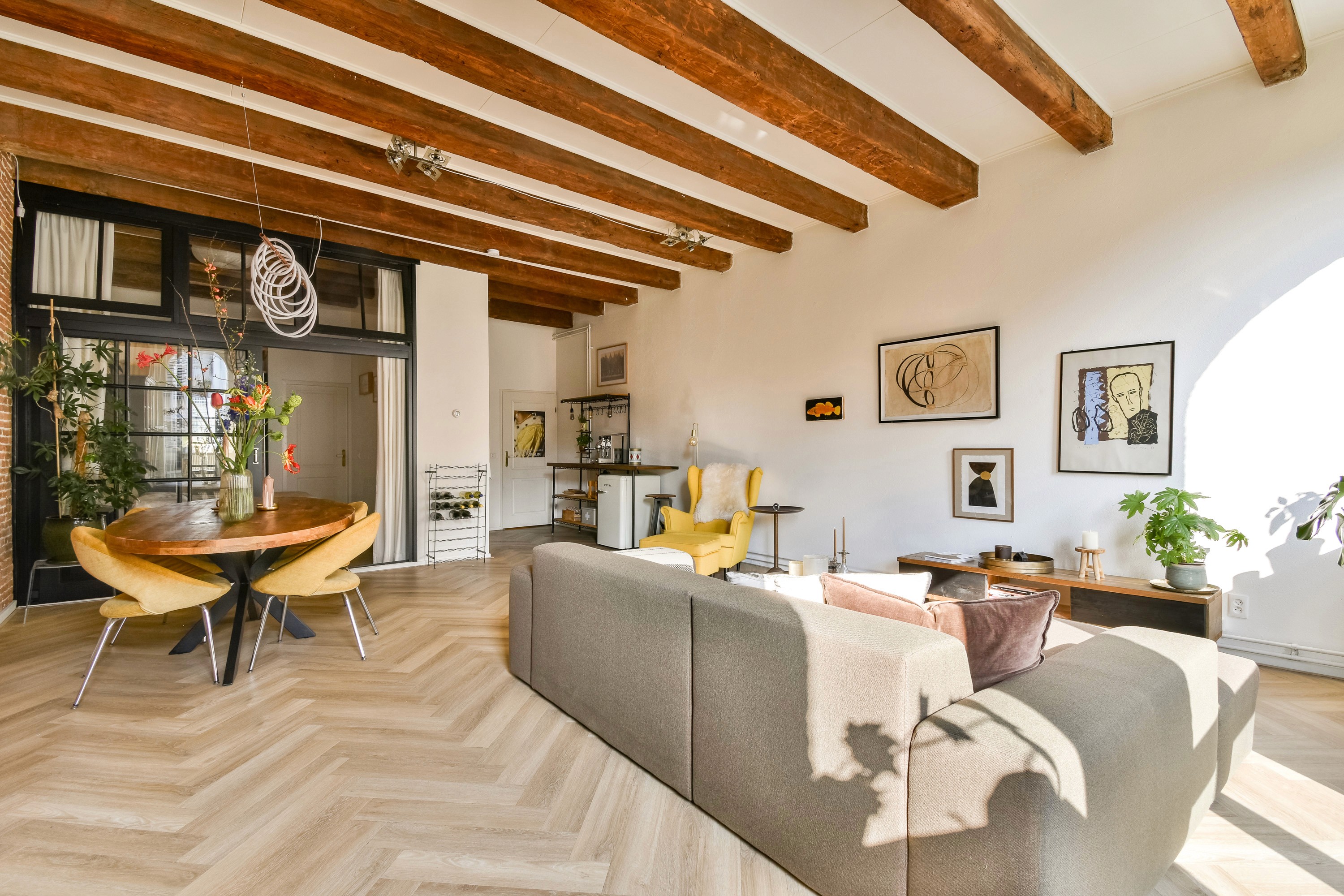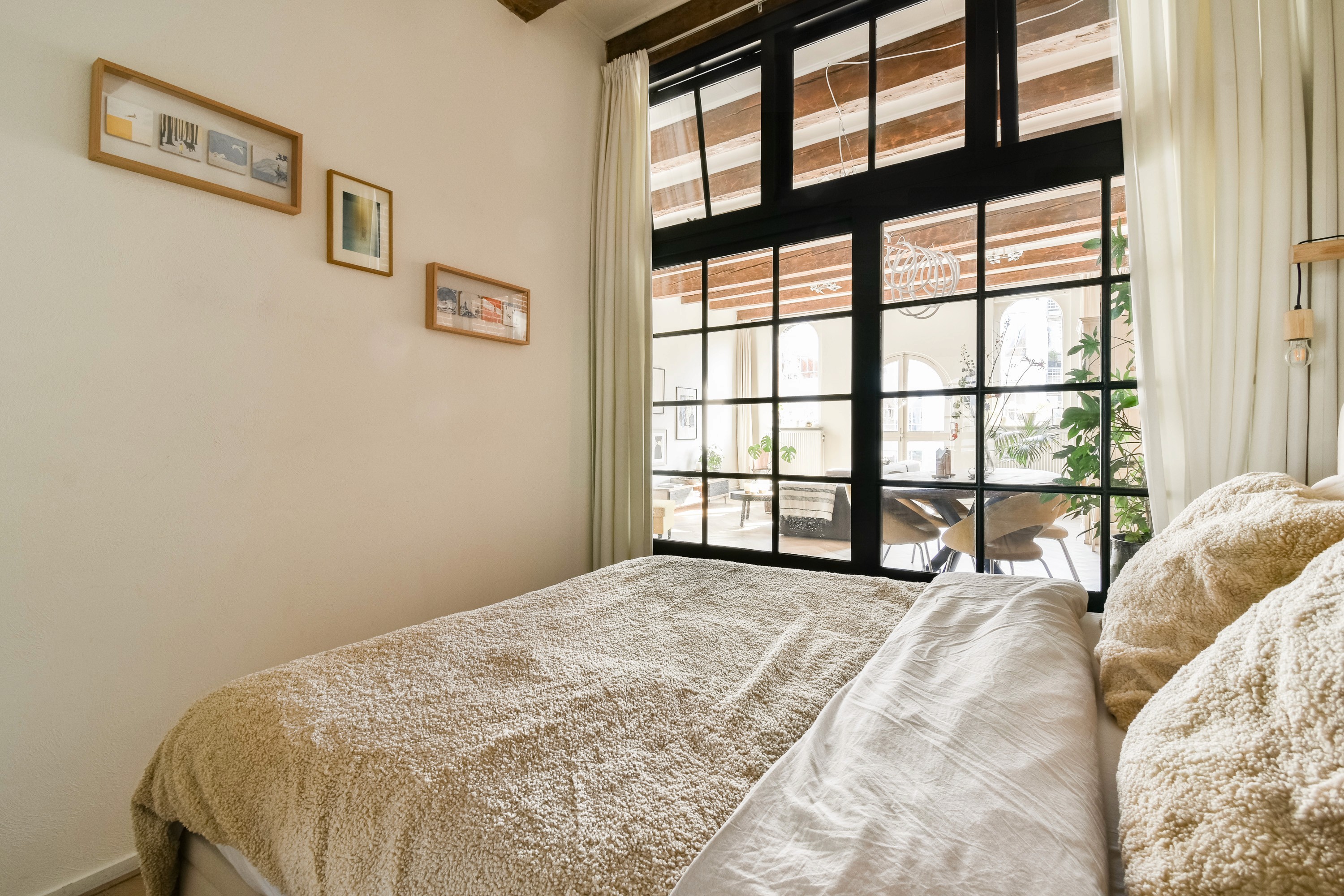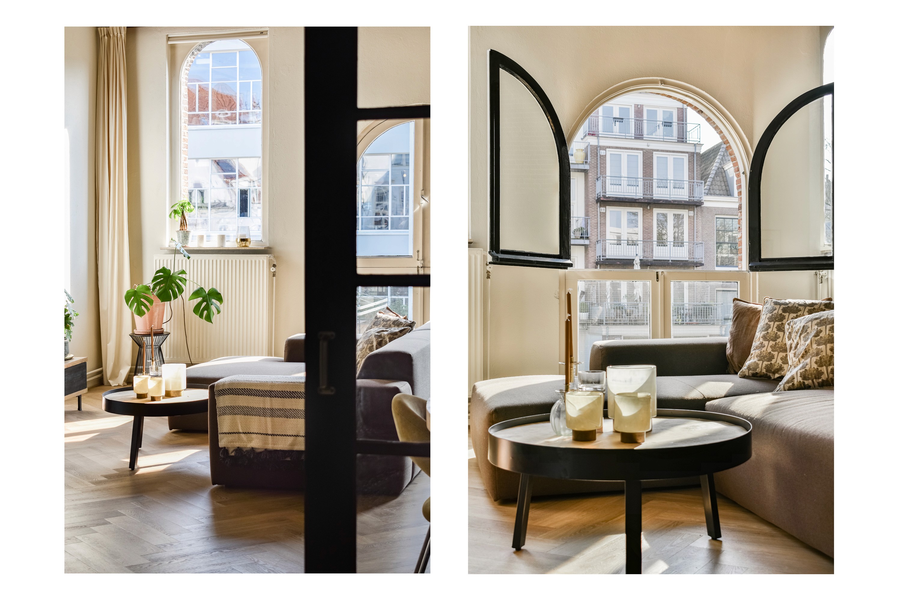 Authentieke houten balken, zichtbare bakstenen muren en karakteristieke boogvensters geven het appartement een unieke sfeer.