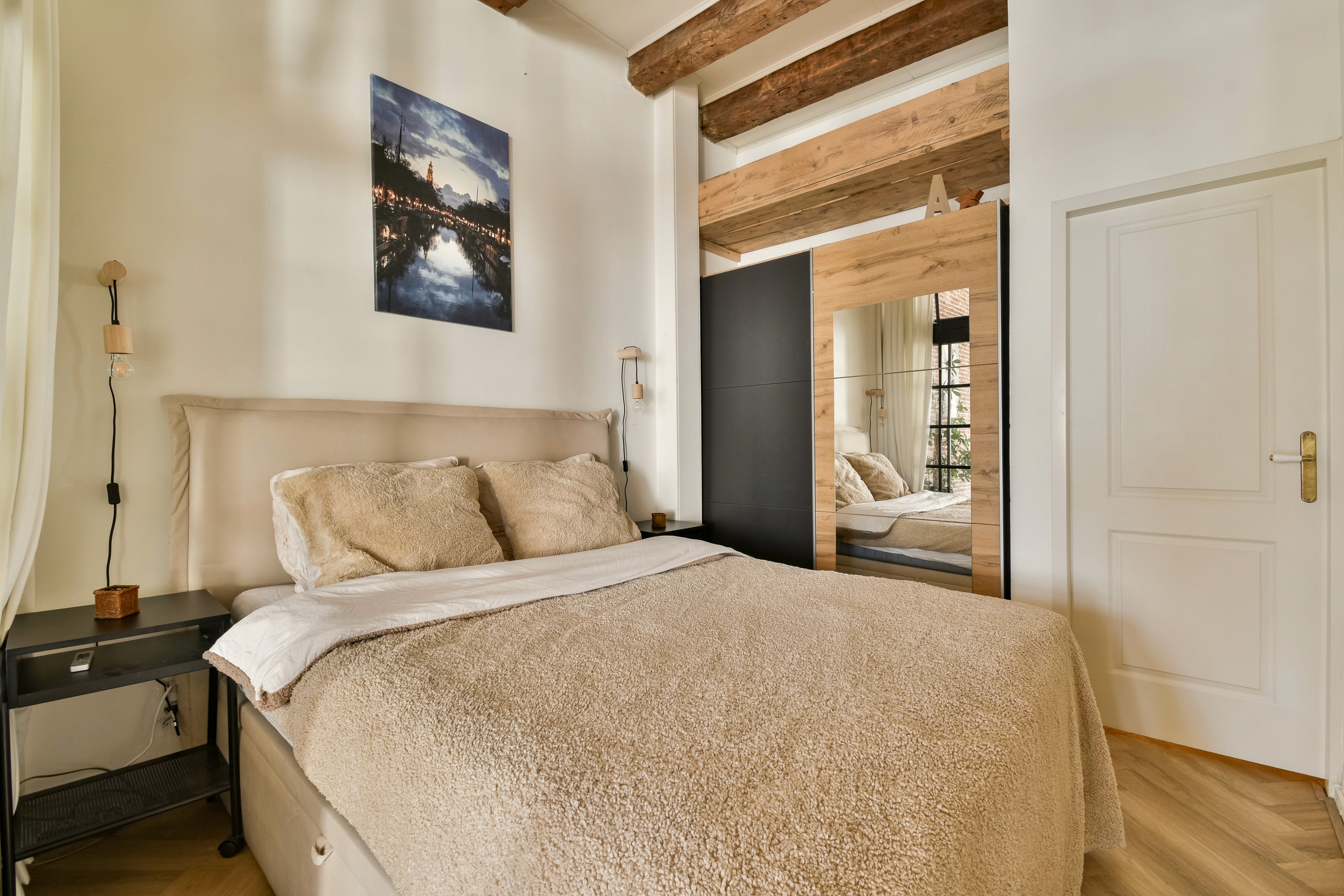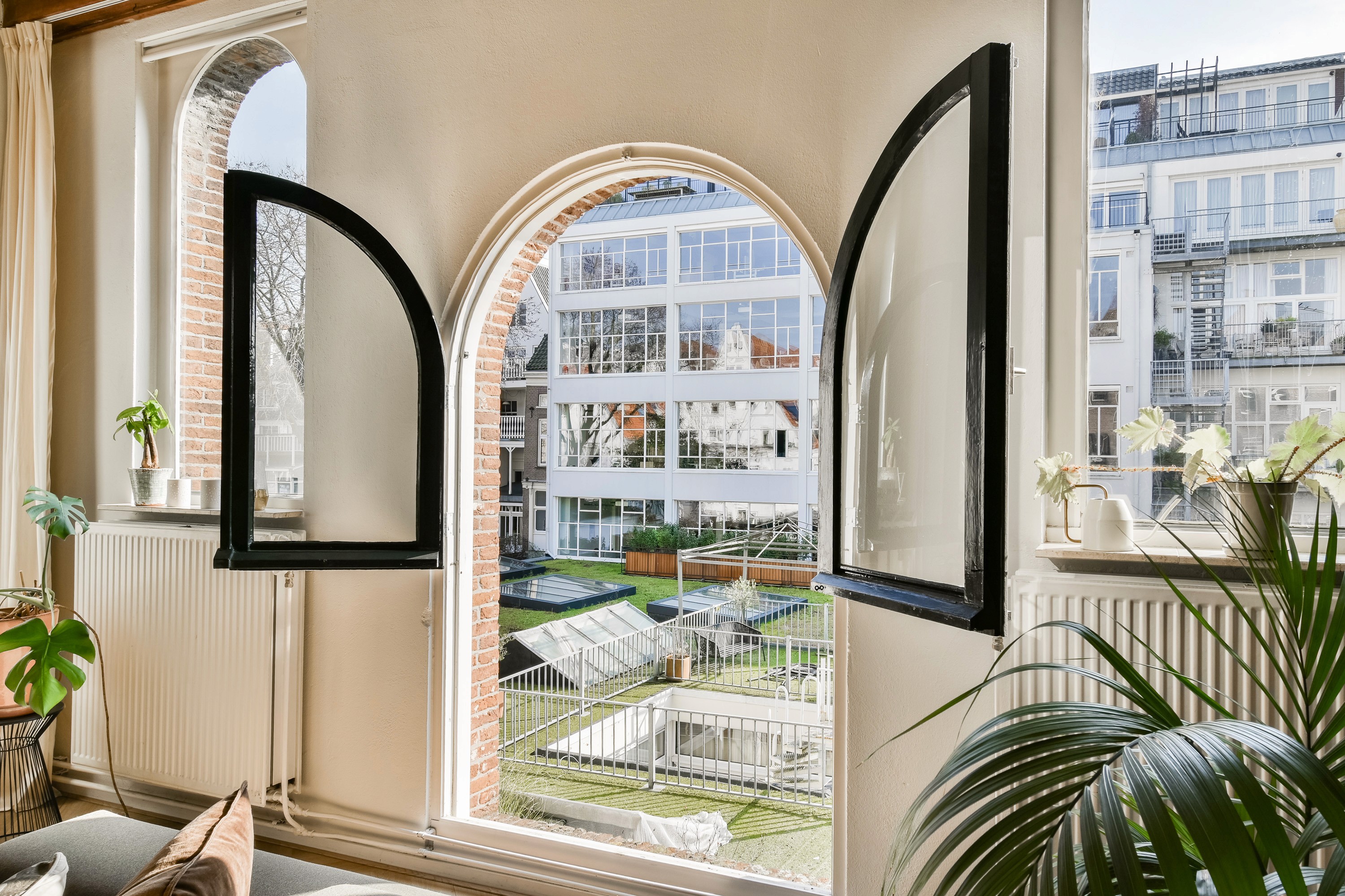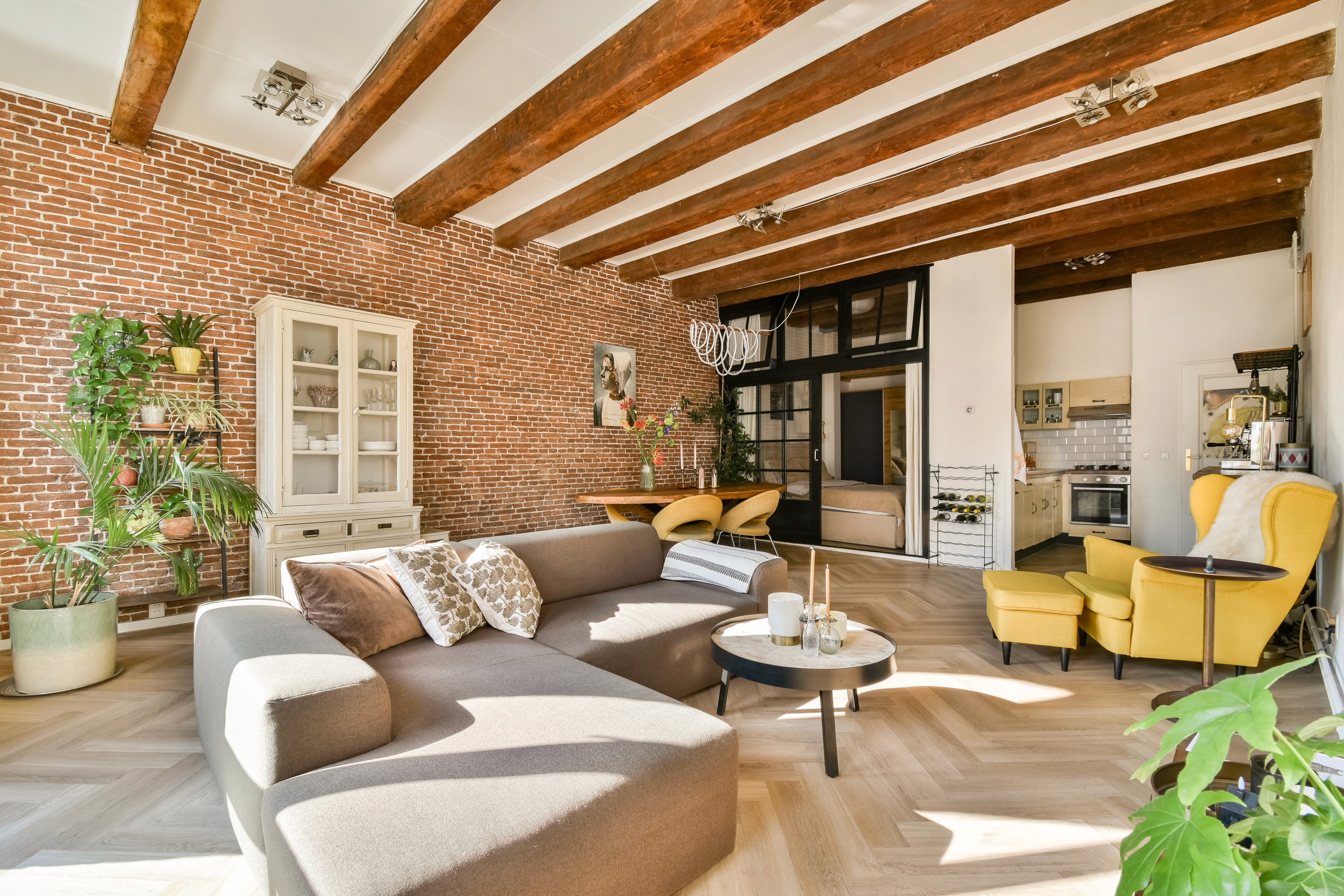 Authentieke houten balken, zichtbare bakstenen muren en karakteristieke boogvensters geven het appartement een unieke sfeer.